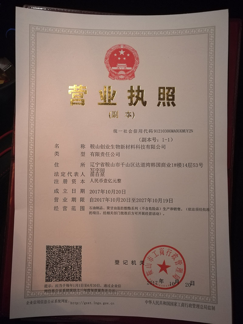 鞍山創(chuàng)業(yè)生物新材料科技有限公司成立于2017年10月,地處鞍山市達(dá)道灣省級(jí)化工園區(qū),周?chē)鷩?guó)道,高速公路,鐵路四通八達(dá),交通便利,物流甚為順通信息快捷,為企業(yè)發(fā)展提供了雄厚便利的基礎(chǔ)。我公司秉承環(huán)保,綠色,科技創(chuàng)新,技術(shù)含量高,你無(wú)我有你有我精的理念,是一家集新材料,精細(xì)食品和化妝品系列等精細(xì)化工行業(yè)的研發(fā),生產(chǎn)和銷(xiāo)售服務(wù)于一體的企業(yè)。